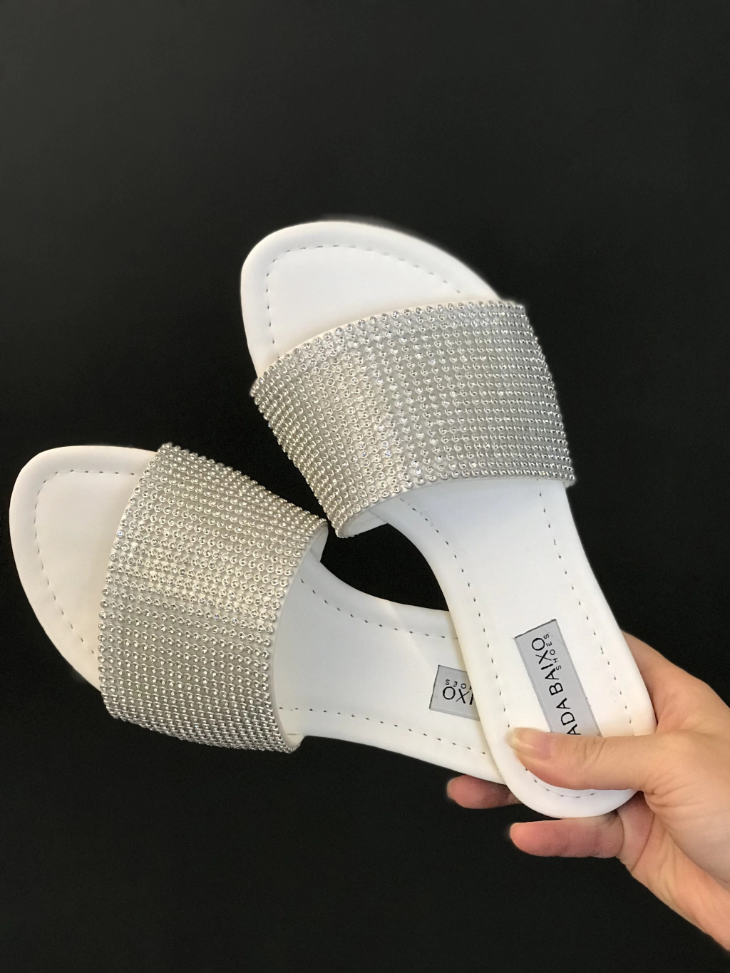 Rasteirinha Agatha solado em gelo, frente arredendoda e com tira larga em strass branco.